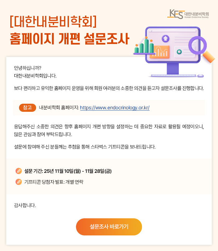 대한내분비학회 홈페이지 개편 설문조사 시행 안내 (11/10~11/28)