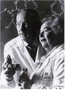 특히 통풍 치료에 있어, 가장 중요한 역사적 발전은 아마도 최초의 잔틴 산화효소 억제제인 알로퓨리놀의 개발일 것이다. 실제로 조지 히칭스(George Hitchings)와 거트루드 엘리언(Gertrude Elion)은 알로퓨리놀 등의 약물을 개발한 공로로 1988년 노벨 생리의학상을 받았다[그림 3].