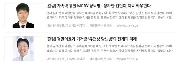 희귀질환위원회는 코리아헬스로그 연재 「내분비 희귀질환, 그 숨겨진 이야기」를 통해 진단이 쉽지 않은 희귀 내분비질환을 지속적으로 소개하고 있습니다. 2024년 1–2월에는 서울대병원 곽수헌 교수, 건국대병원 최종한 교수께서 유전성 당뇨병(MODY)을 주제로 두 편의 칼럼을 집필해 주셨습니다. 컬럼 내용은 GCK-MODY, HNF1A-MODY 등 단일유전자당뇨병 아형의 특징과 치료의 차이를 실제 사례 중심으로 설명되었으며, , 유전자 기반 진단이 불필요한 치료를 줄이고 환자·가족의 관리 방향까지 바꿀 수 있음을 강조했습니다. 의료현장에서 흔히 놓치기 쉬운 MODY의 핵심 감별 포인트를 명확하게 정리해 주셨습니다. 바쁜 일정에도 귀중한 내용을 작성해주신 두 교수님께 다시 한번 더 깊이 감사드립니다. 자세한 내용은 Korea Health Log 연재 페이지(https://www.koreahealthlog.com/news/articleList.html?sc_sub_section_code=S2N50&view_type=sm)에서 확인하실 수 있습니다.
