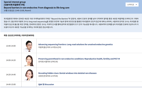 이번 추계학술대회에서 희귀질환위원회가 주관한 심포지엄 “Beyond barriers in rare endocrine: From diagnosis to life-long care”가 성공적으로 진행되었습니다. 유전학–산부인과–치과가 함께 참여한 다학제(multidisciplinary) 구성으로 진행되었습니다. long-read sequencing을 포함한 유전진단 기술(이범희 교수님), 희귀 내분비질환 환자의 생식건강·PGT-M(한지연 교수님), 치과적 단서를 통한 골희귀질환 조기진단(강정민 교수님) 등 다양한 임상과가 참여한 다학제 세션으로 구성되었으며, 진단부터 장기 관리까지 폭넓은 논의가 이루어졌습니다.