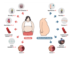 Effects of obesity and abdominal obesity on the risks of other diseases according to studies analyzing the Korean National Health Information Database. ↑ depicts a linear increase in the risk, U depicts an increase in the risk both in low and high body mass index groups. COVID-19, coronavirus disease 2019.